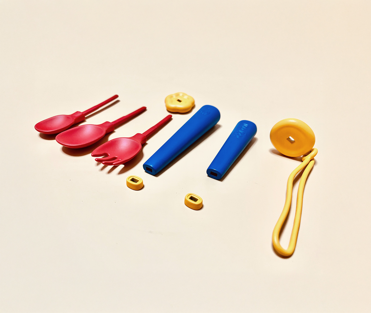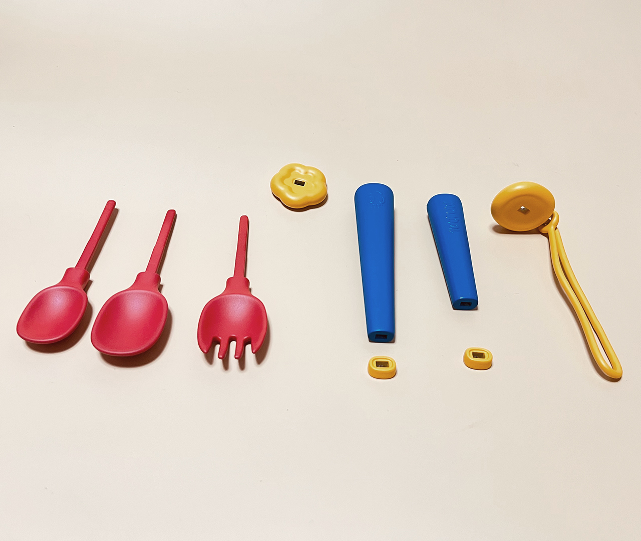 유아용 조립식 수저세트로 적은 파츠로 여러가지 형태의 수저를 조립 할 수 있는 제품